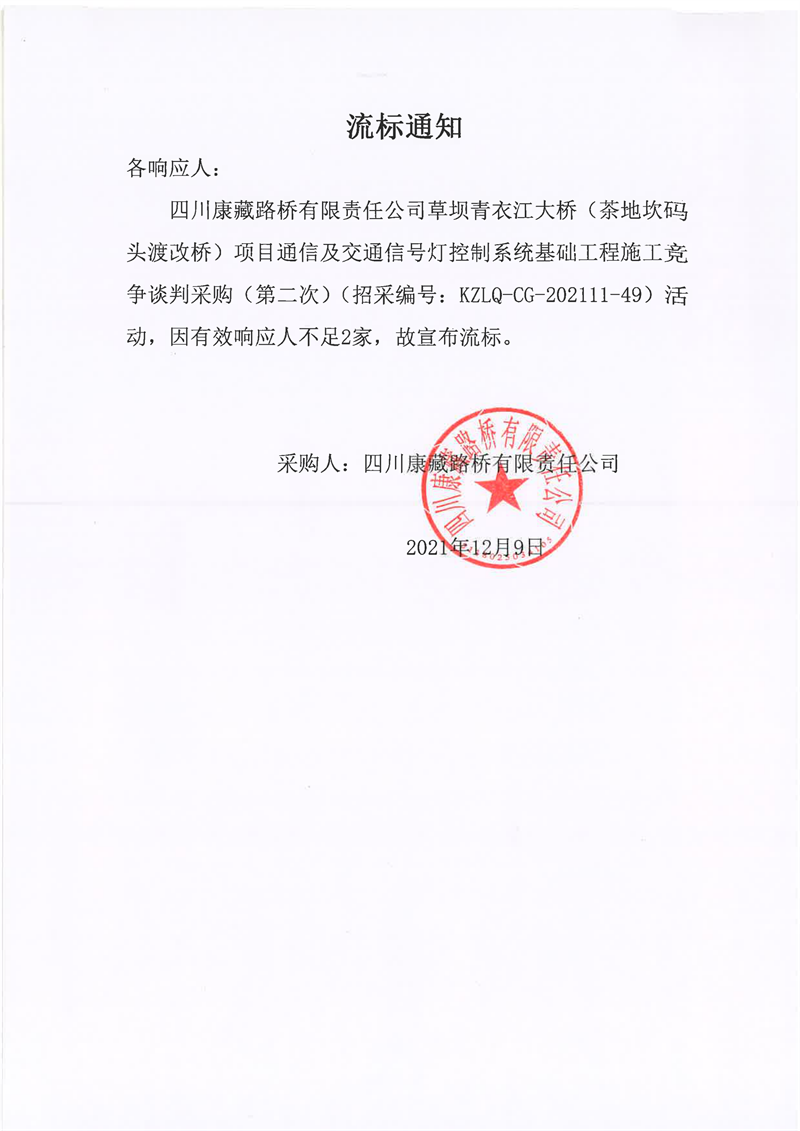 四川康藏路橋有限責(zé)任公司草壩青衣江大橋(茶地坎碼頭渡改橋)項(xiàng)目通信及交通信號(hào)燈控制系統(tǒng)基礎(chǔ)工程施工競爭談判采購(第二次)流標(biāo)通知