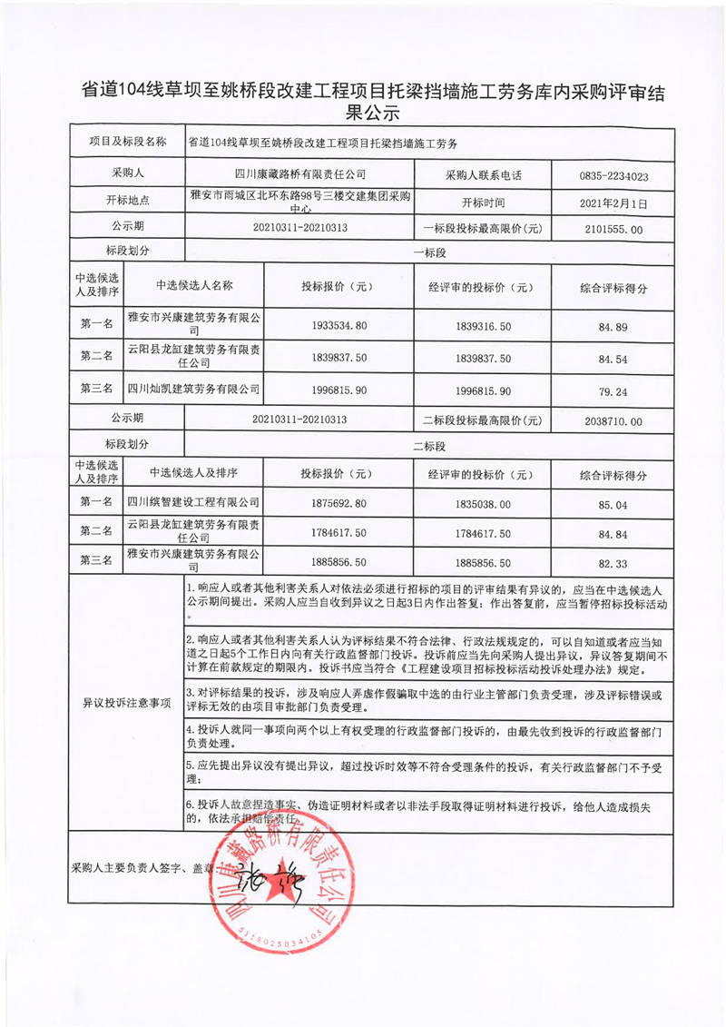 四川康藏路橋有限責(zé)任公司省道104線草壩至姚橋段改建工程項(xiàng)目托梁擋墻施工勞務(wù)庫(kù)內(nèi)采購(gòu)評(píng)審結(jié)果公示