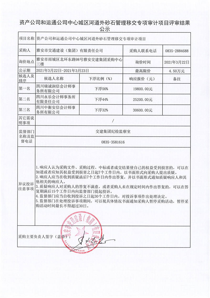 雅安市交通建設(集團)有限責任公司資產(chǎn)公司和運通公司中心城區(qū)河道外砂石管理移交專項審計項目評審結果公示