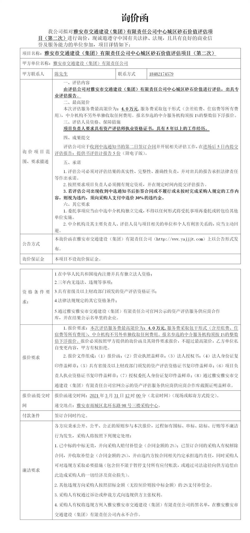雅安市交通建設(shè)(集團(tuán))有限責(zé)任公司中心城區(qū)砂石價值評估項(xiàng)目(第二次)詢價函