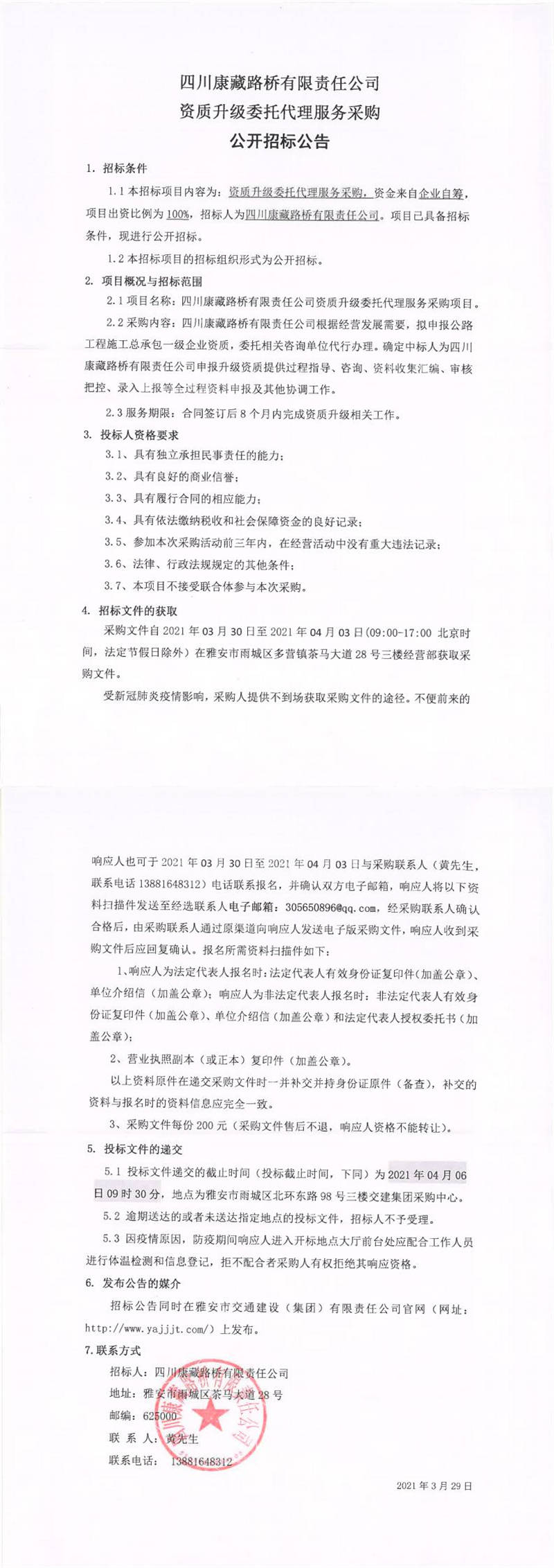 四川康藏路橋有限責任公司資質(zhì)升級委托代理服務采購公開招標公告