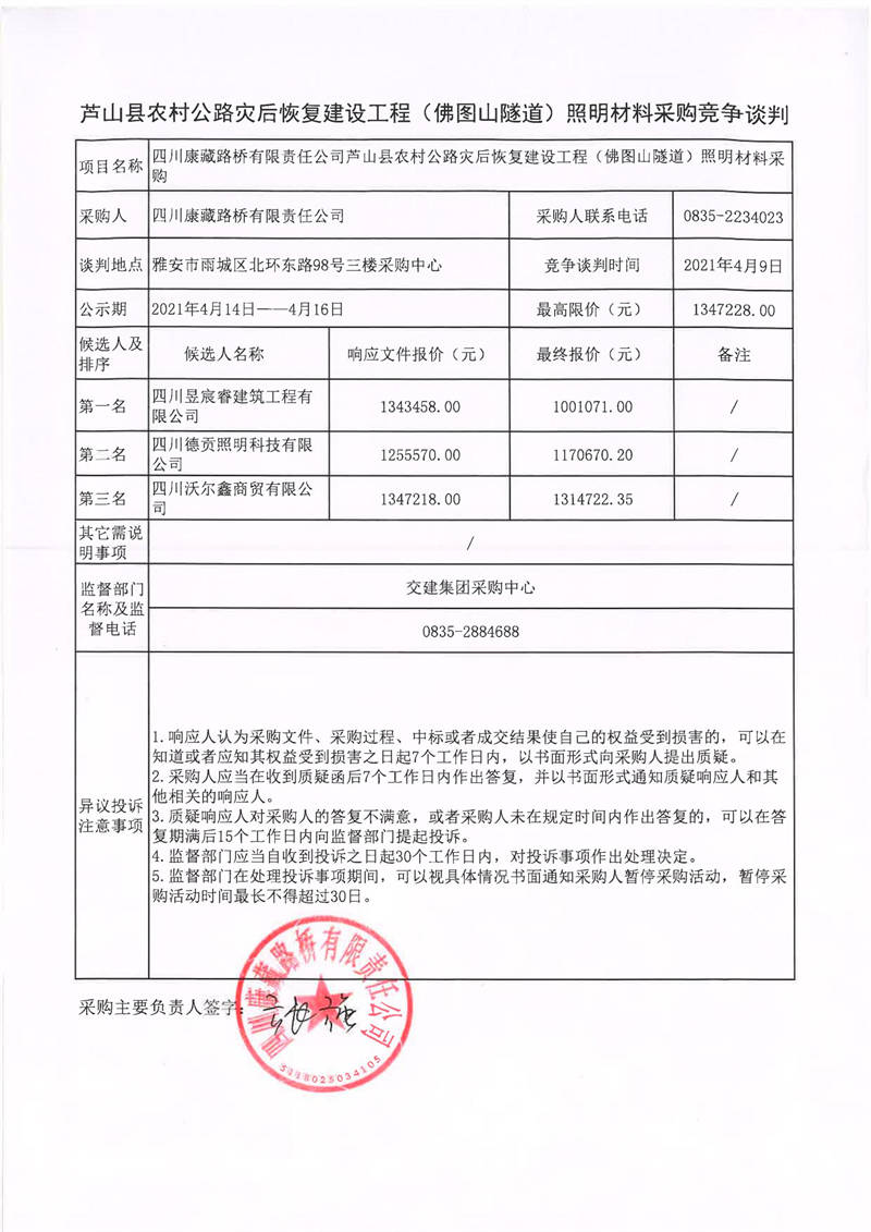 四川康藏路橋有限責任公司蘆山縣農(nóng)村公路災(zāi)后恢復(fù)建設(shè)工程(佛圖山隧道)照明材料采購競爭談判結(jié)果公示
