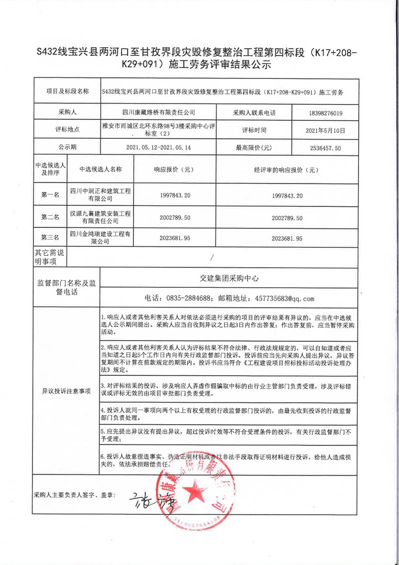 四川康藏路橋有限責(zé)任公司S432線寶興縣兩河口至甘孜界段災(zāi)毀修復(fù)整治工程第四標(biāo)段(K17+208-K29+091)施工勞務(wù)評(píng)審結(jié)果公示