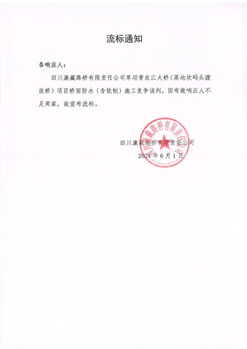四川康藏路橋有限責(zé)任公司草壩青衣江大橋(茶地坎碼頭渡改橋)項(xiàng)目橋面防水(含銑刨)施工競爭談判流標(biāo)通知