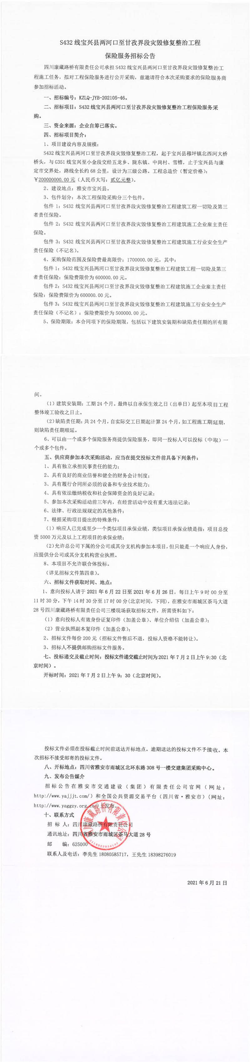 四川康藏路橋有限責任公司S432線寶興縣兩河口至甘孜界段災毀修復整治工程保險服務招標公告