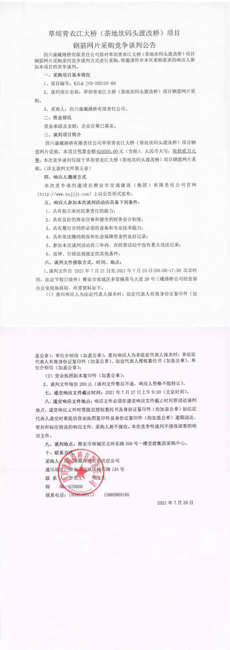 四川康藏路橋有限責任公司草壩青衣江大橋(茶地坎碼頭渡改橋)項目鋼筋網片采購競爭談判公告