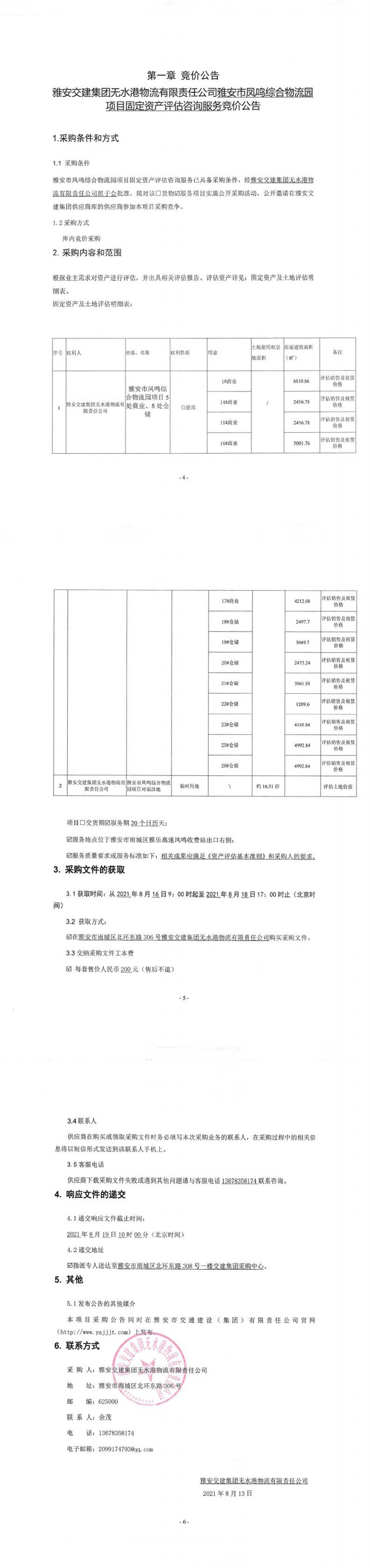 雅安交建集團無水港物流有限責任公司雅安市鳳鳴綜合物流園項目固定資產評估咨詢服務競價公告