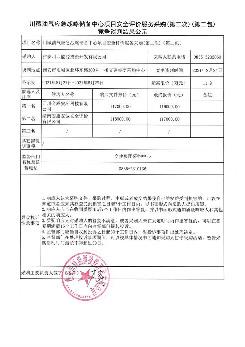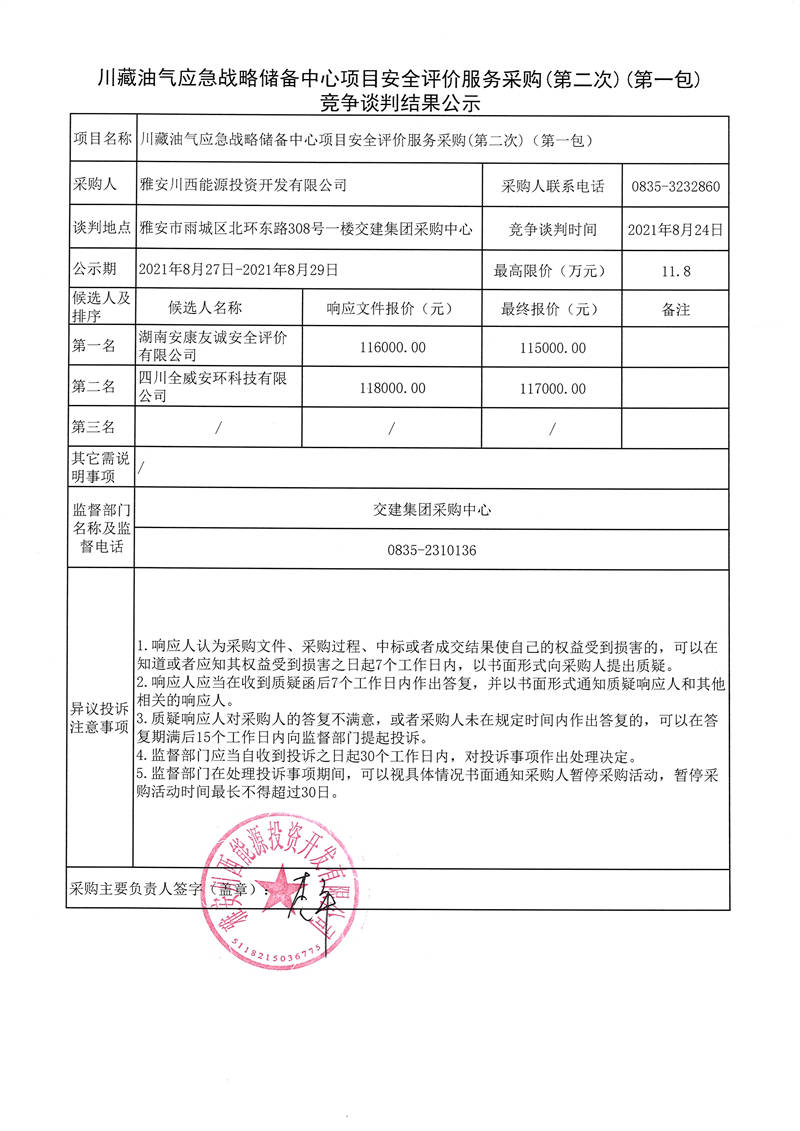 川藏油氣應(yīng)急戰(zhàn)略儲(chǔ)備中心項(xiàng)目安全評(píng)價(jià)服務(wù)采購(gòu)(第二次)(第一包、第二包)競(jìng)爭(zhēng)談判結(jié)果公示