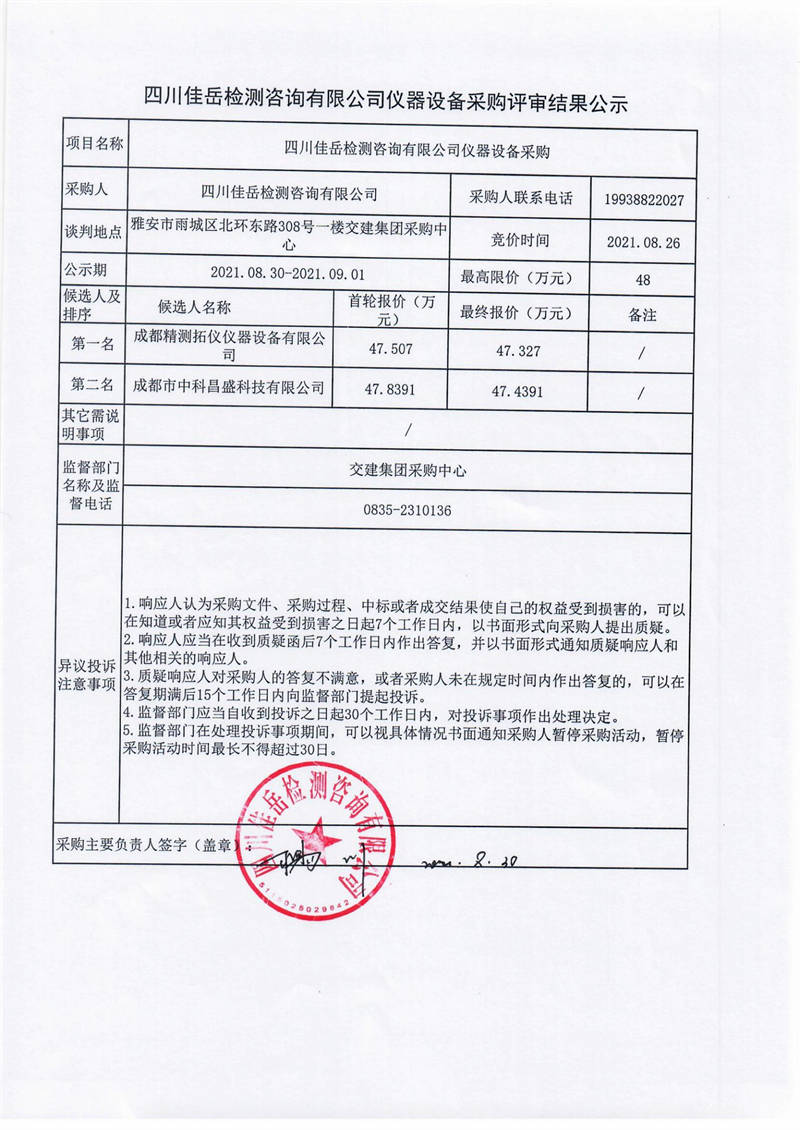 四川佳岳檢測(cè)咨詢有限公司儀器設(shè)備采購(gòu)評(píng)審結(jié)果公示