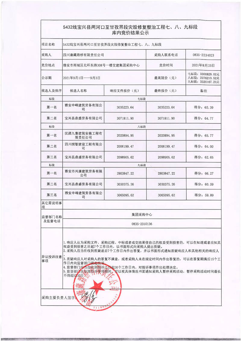 四川康藏路橋有限責(zé)任公司S432線(xiàn)寶興縣兩河口至甘孜界段災(zāi)毀修復(fù)整治工程七、八、九標(biāo)段庫(kù)內(nèi)競(jìng)價(jià)結(jié)果公示