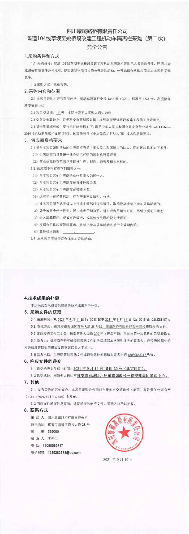 四川康藏路橋有限責任公司省道104線草壩至姚橋段改建工程機動車隔離欄采購(第二次)競價公告