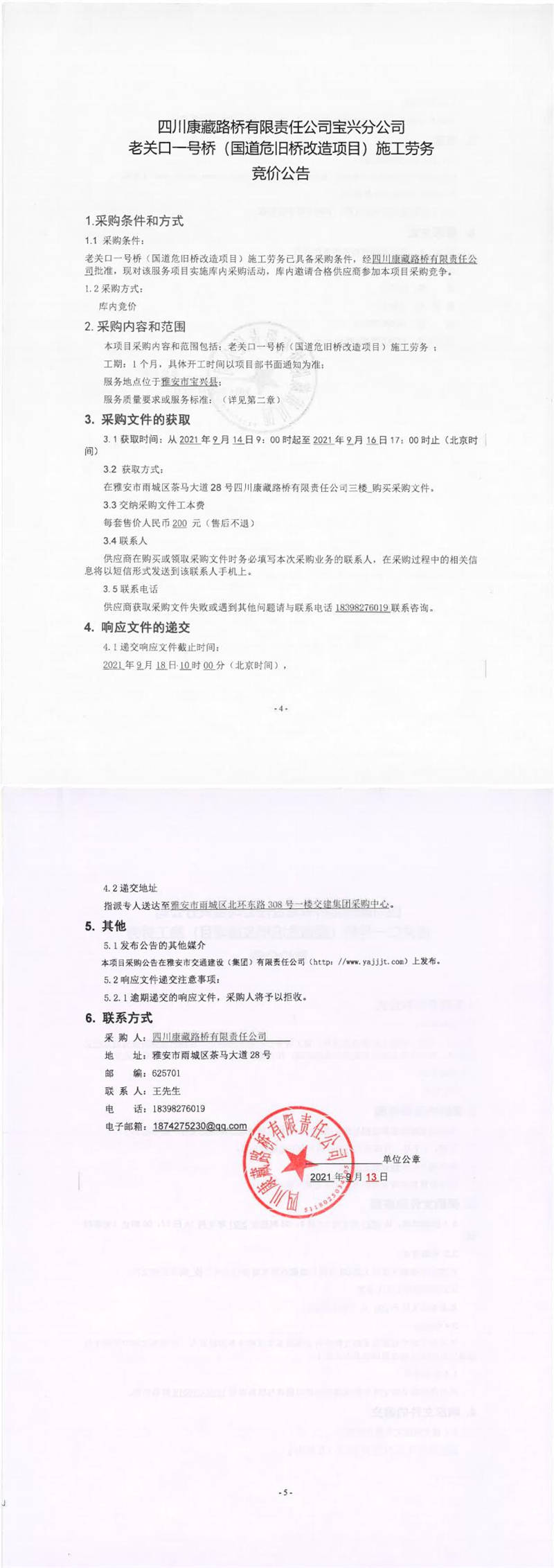 四川康藏路橋有限責(zé)任公司寶興分公司老關(guān)口一號(hào)橋(國道危舊橋改造項(xiàng)目)施工勞務(wù)競(jìng)價(jià)公告