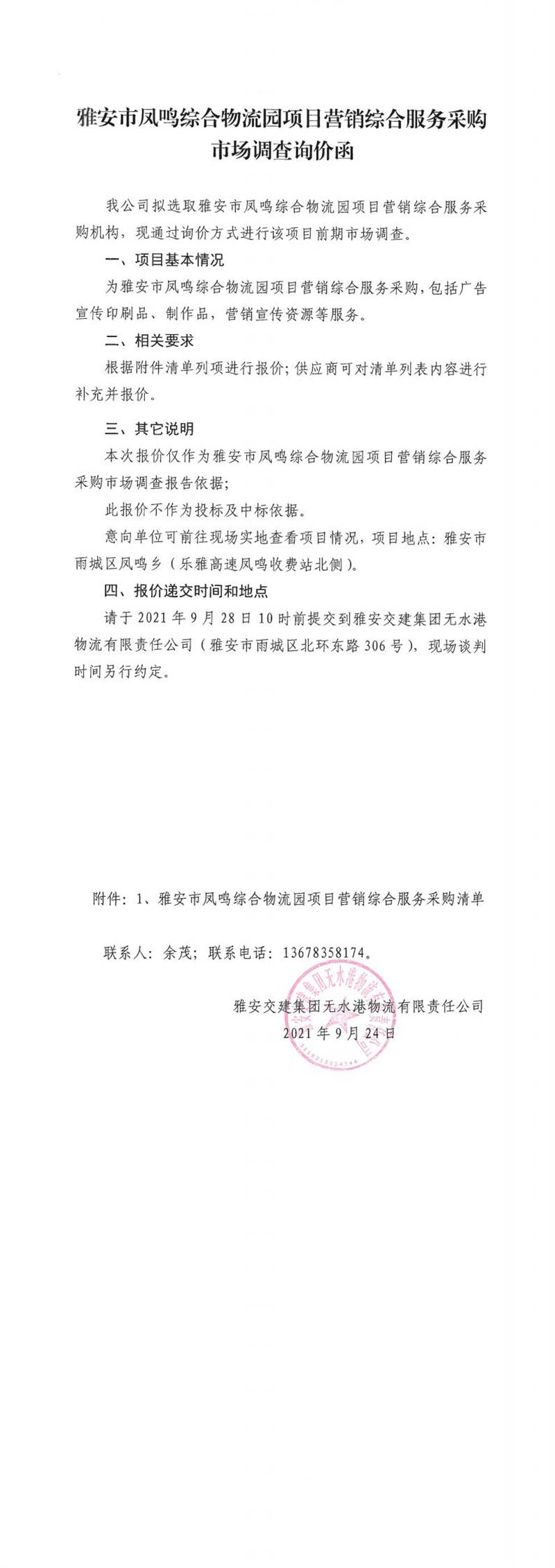 雅安交建集團無水港物流有限責(zé)任公司雅安市鳳鳴綜合物流園項目營銷綜合服務(wù)采購市場調(diào)查詢價函