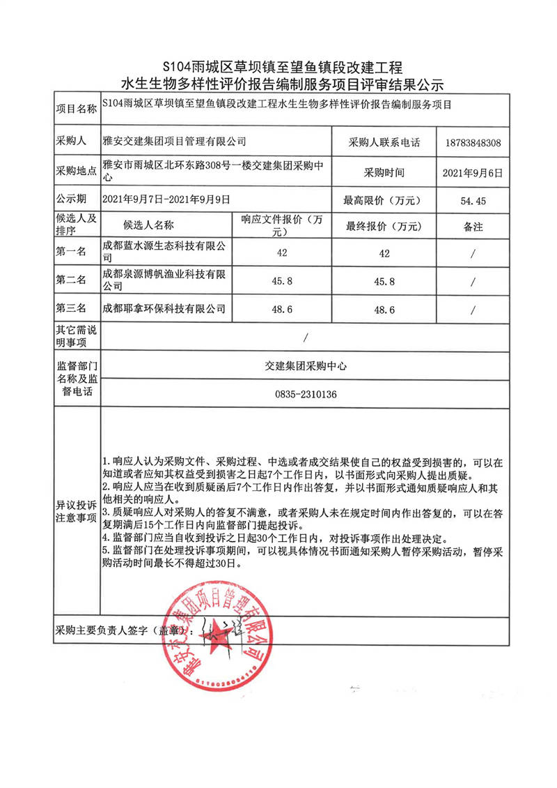 雅安交建集團(tuán)項(xiàng)目管理有限公司S104雨城區(qū)草壩鎮(zhèn)至望魚鎮(zhèn)段改建工程水生生物多樣性評(píng)價(jià)報(bào)告編制服務(wù)項(xiàng)目評(píng)審結(jié)果公示