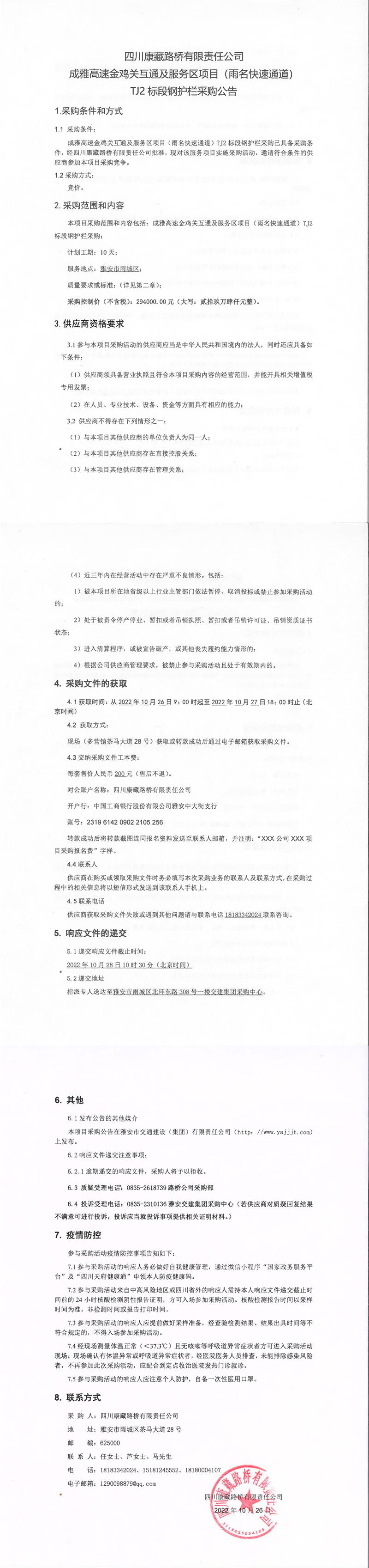 四川康藏路橋有限責(zé)任公司成雅高速金雞關(guān)互通及服務(wù)區(qū)項(xiàng)目(雨名快速通道)TJ2標(biāo)段鋼護(hù)欄采購(gòu)公告