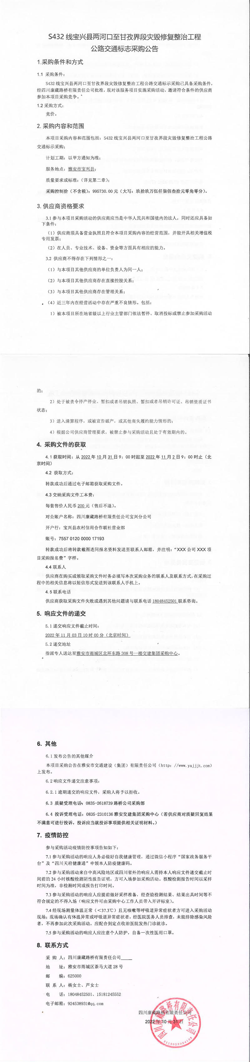 四川康藏路橋有限責(zé)任公司S432線寶興縣兩河口至甘孜界段災(zāi)毀修復(fù)整治工程公路交通標(biāo)志采購(gòu)公告