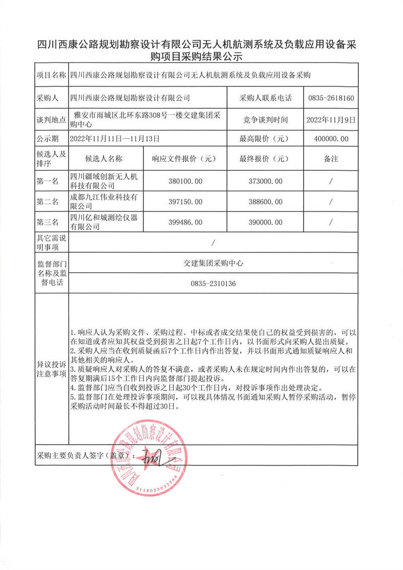 四川西康公路規(guī)劃勘察設計有限公司無人機航測系統(tǒng)及負載應用設備采購項目采購結果公示