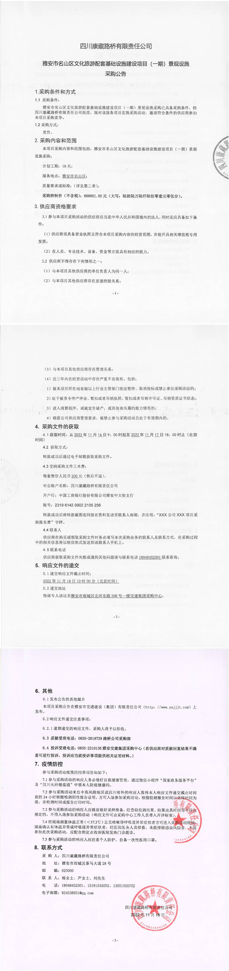 四川康藏路橋有限責(zé)任公司雅安市名山區(qū)文化旅游配套基礎(chǔ)設(shè)施建設(shè)項(xiàng)目(一期)景觀設(shè)施采購(gòu)公告