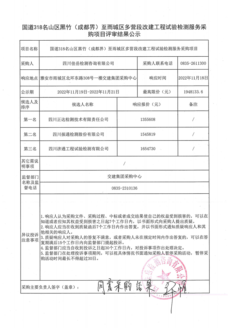 四川佳岳檢測咨詢有限公司國道318名山區(qū)黑竹(成都界)至雨城區(qū)多營段改建工程試驗檢測服務(wù)采購項目評審結(jié)果公示