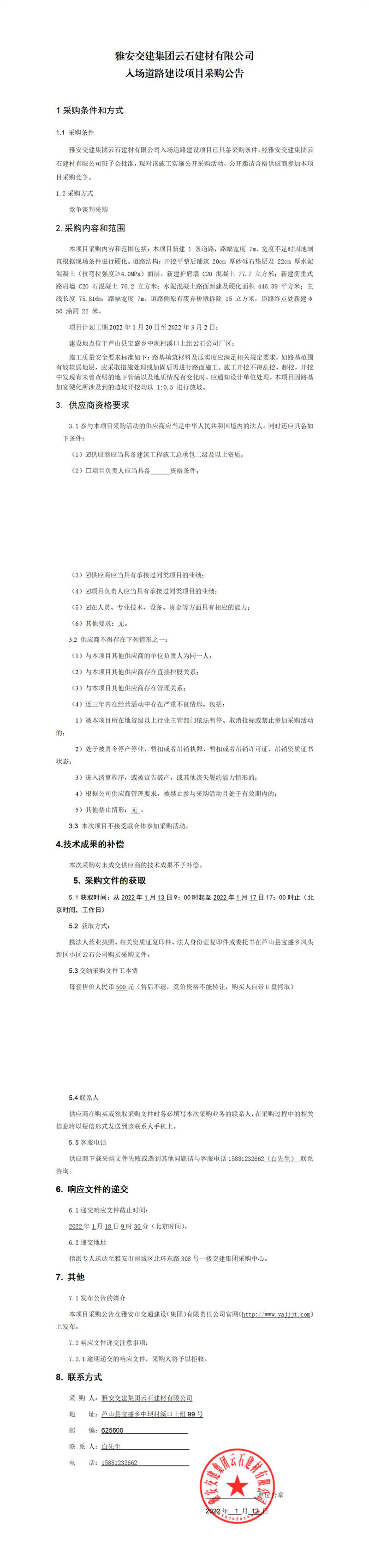 雅安交建集團(tuán)云石建材有限公司入場道路建設(shè)項目采購公告
