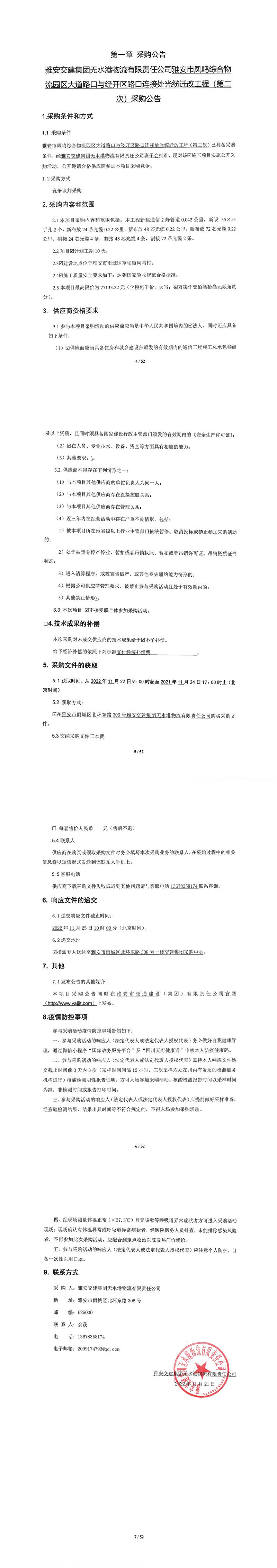 雅安交建集團(tuán)無水港物流有限責(zé)任公司雅安市鳳鳴綜合物流園區(qū)大道路口與經(jīng)開區(qū)路口連接處光纜遷改工程(第二次)采購(gòu)公告