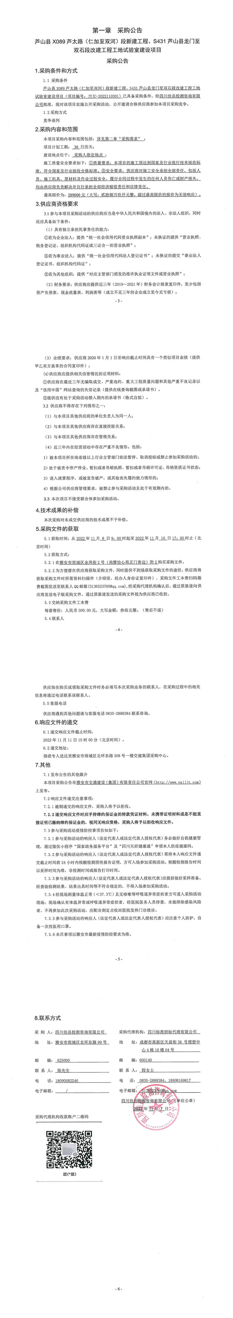 四川佳岳檢測咨詢有限公司蘆山縣X089蘆太路(仁加至雙河)段新建工程、S431蘆山縣龍門至雙石段改建工程工地試驗室建設(shè)項目采購公告