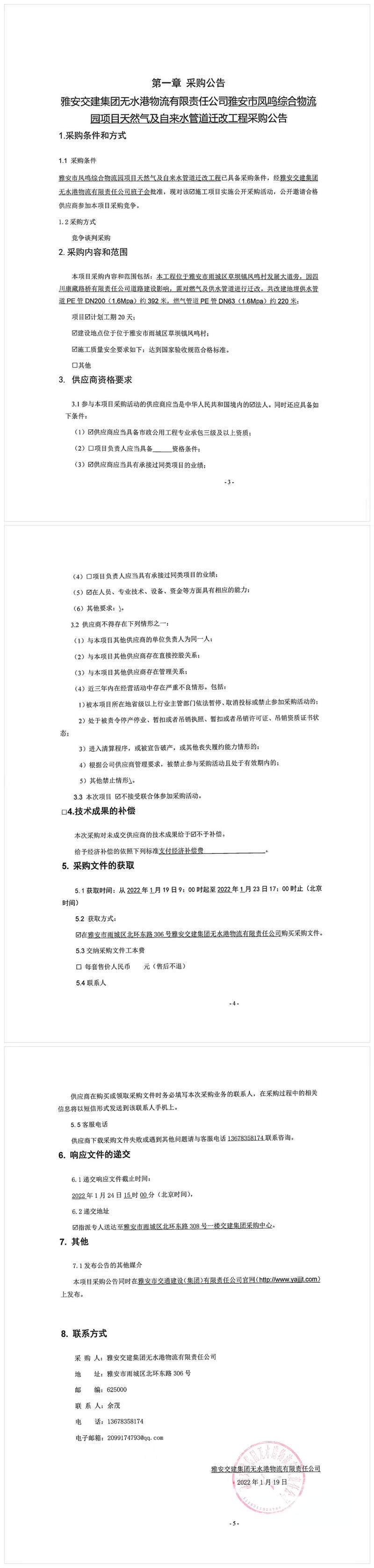 雅安交建集團無水港物流有限責任公司雅安市鳳鳴綜合物流園項目天然氣及自來水管道遷改工程采購公告