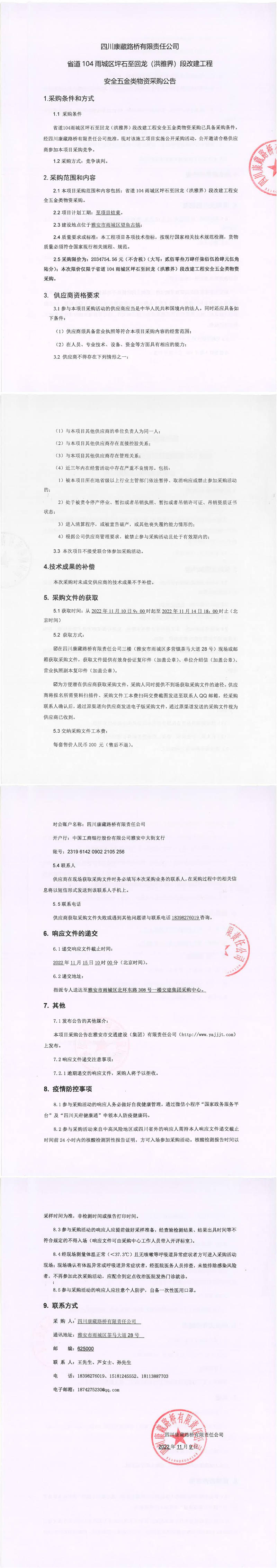 四川康藏路橋有限責(zé)任公司省道104雨城區(qū)坪石至回龍(洪雅界)段改建工程安全五金類物資采購(gòu)公告