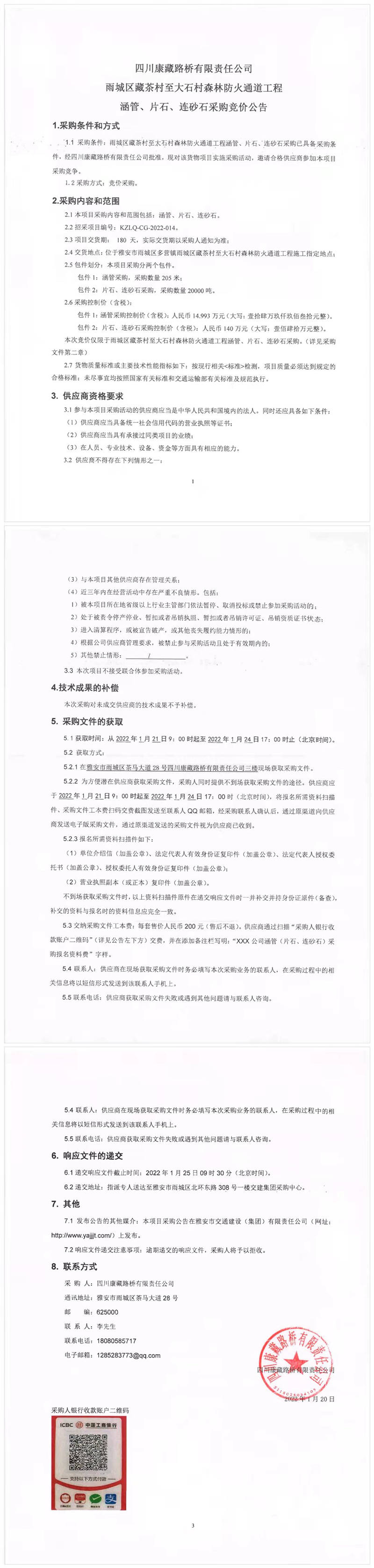 四川康藏路橋有限責(zé)任公司雨城區(qū)藏茶村至大石村森林防火通道工程涵管、片石、連砂石采購(gòu)競(jìng)價(jià)公告