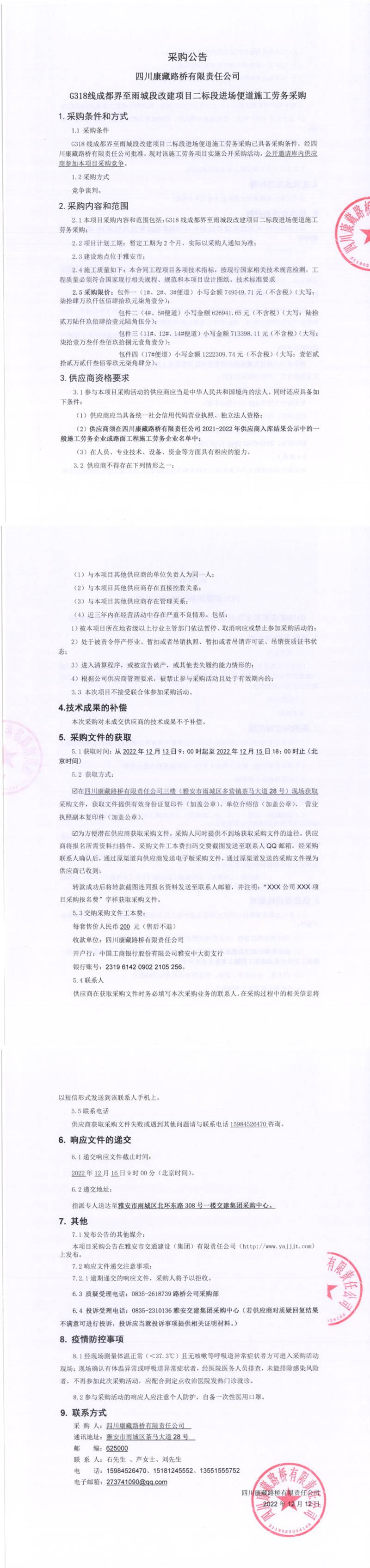 四川康藏路橋有限責(zé)任公司G318線成都界至雨城段新改建項(xiàng)目二標(biāo)段進(jìn)場(chǎng)便道施工勞務(wù)采購(gòu)公告