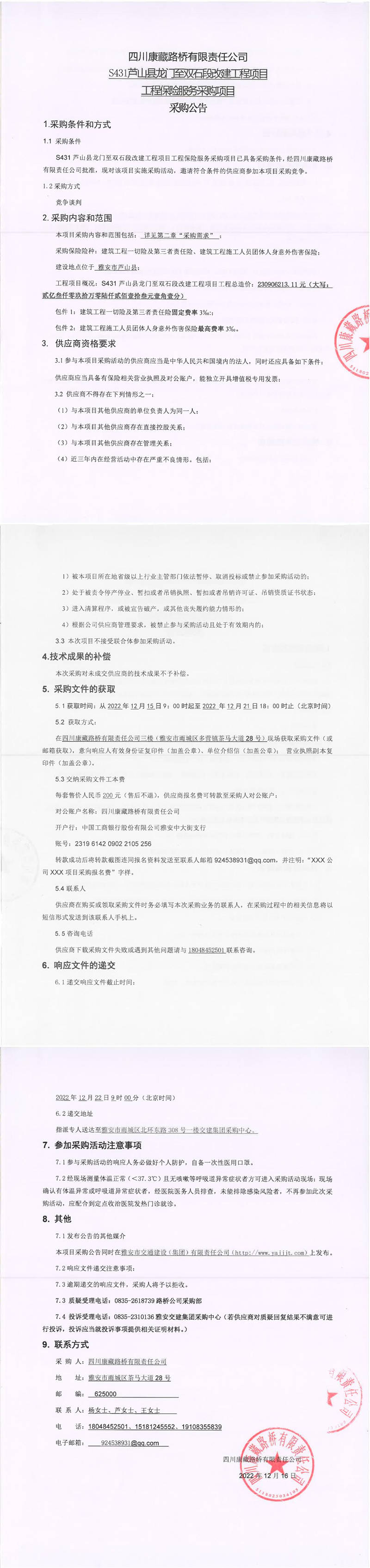 四川康藏路橋有限責(zé)任公司S431蘆山縣龍門至雙石段改建工程項(xiàng)目工程保險(xiǎn)服務(wù)采購項(xiàng)目采購公告