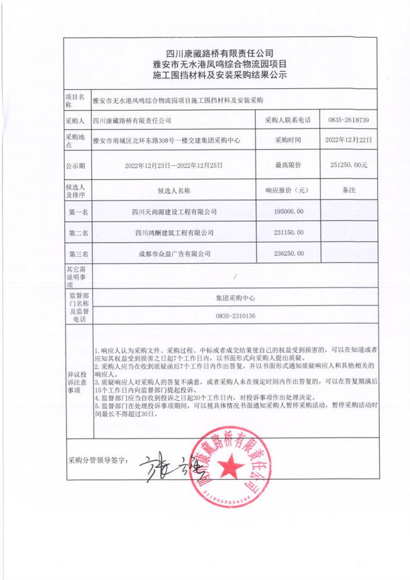 四川康藏路橋有限責任公司雅安市無水港鳳鳴綜合物流園項目施工圍擋材料及安裝采購結果公示