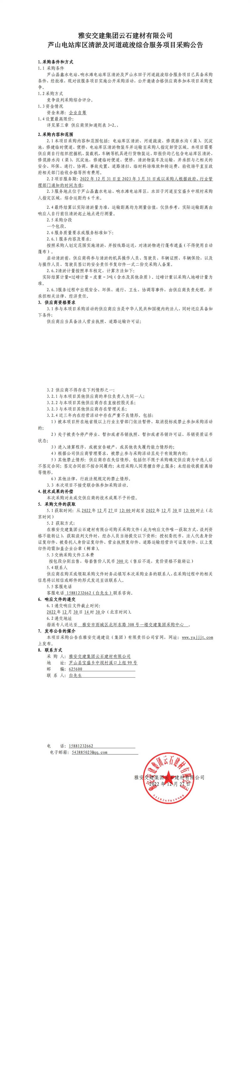 雅安交建集團(tuán)云石建材有限公司蘆山電站庫區(qū)清淤及河道疏浚綜合服務(wù)項目采購公告