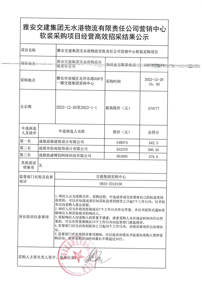 雅安交建集團(tuán)無(wú)水港物流有限責(zé)任公司營(yíng)銷(xiāo)中心軟裝采購(gòu)項(xiàng)目經(jīng)營(yíng)高效招采結(jié)果公示
