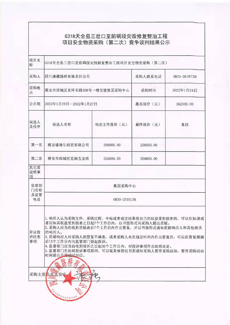 四川康藏路橋有限責(zé)任公司G318天全縣三岔口至前碉段災(zāi)毀修復(fù)整治工程項目安全物資采購(第二次)競爭談判結(jié)果公示