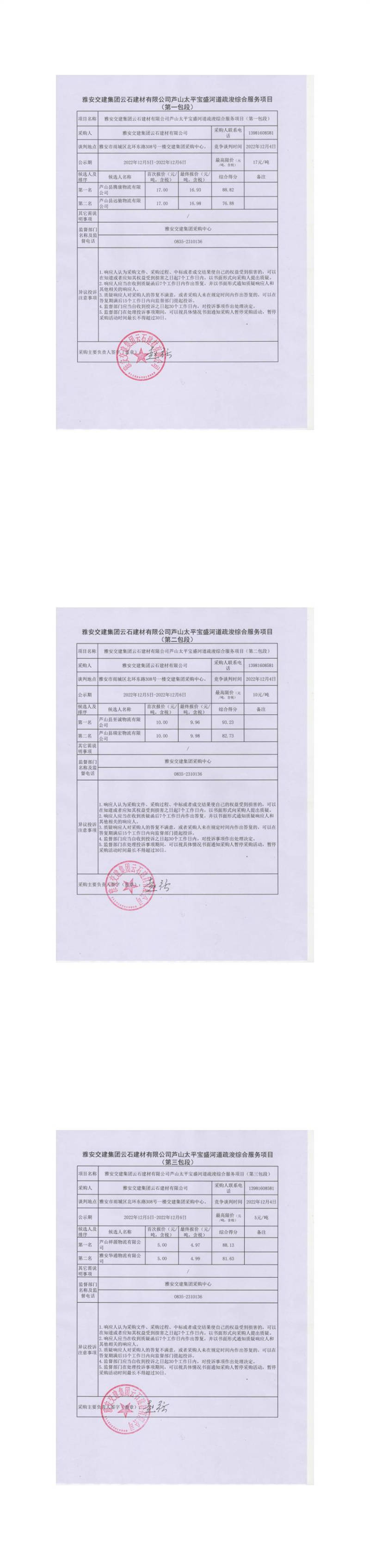 雅安交建集團云石建材有限公司蘆山太平寶盛河道疏浚綜合服務(wù)項目(第一包段、第二包段、第三包段)結(jié)果公示
