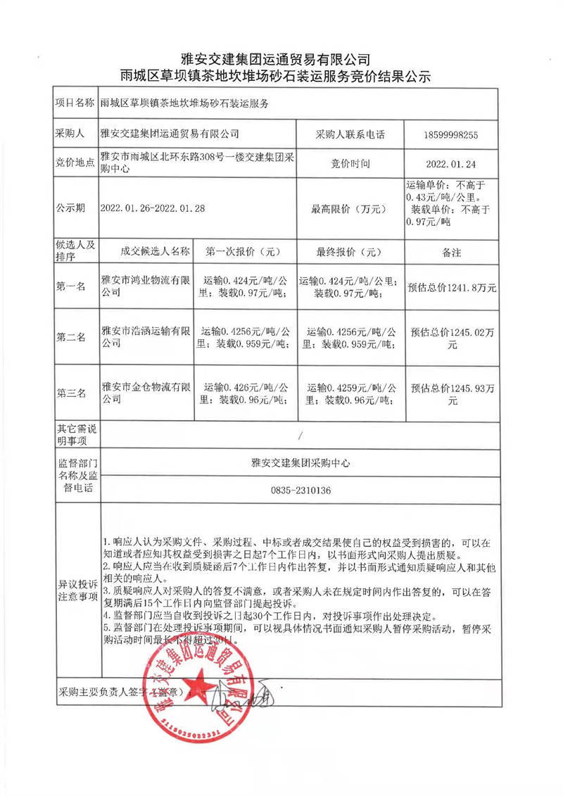 雅安交建集團運通貿(mào)易有限公司雨城區(qū)草壩鎮(zhèn)茶地坎堆場砂石裝運服務(wù)競價結(jié)果公示