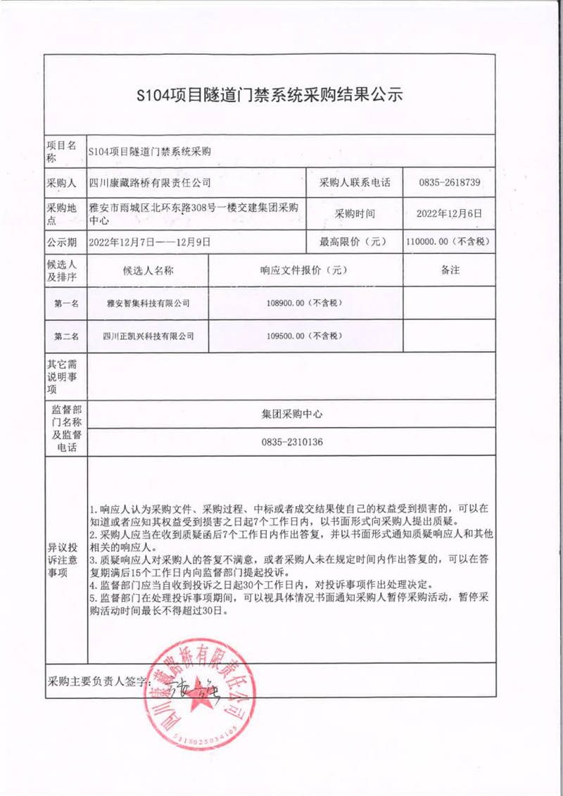 四川康藏路橋有限責(zé)任公司S104項(xiàng)目隧道門(mén)禁系統(tǒng)采購(gòu)結(jié)果公示