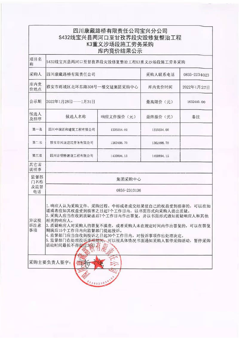 四川康藏路橋有限責任公司寶興分公司S432線寶興縣兩河口至甘孜界段災毀修復整治工程K3重義沙場段施工勞務采購庫內(nèi)競價結(jié)果公示