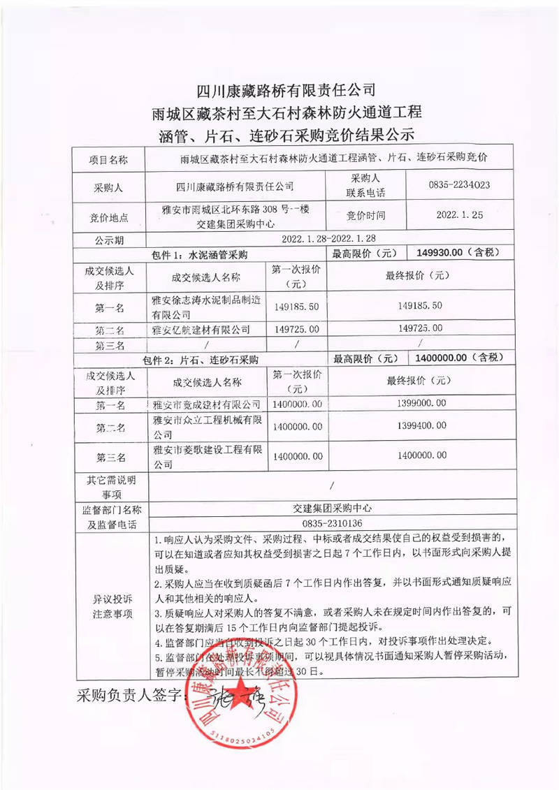 四川康藏路橋有限責(zé)任公司雨城區(qū)藏茶村至大石村森林防火通道工程涵管、片石、連砂石采購競價結(jié)果公示