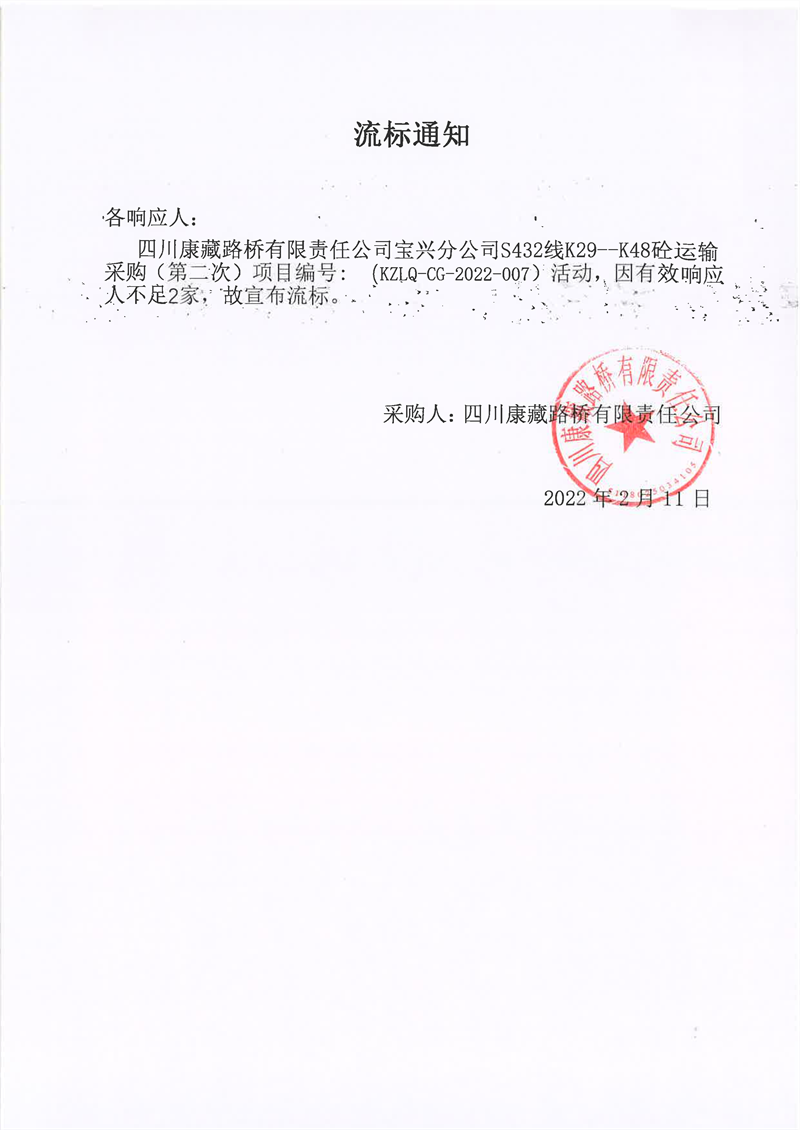 四川康藏路橋有限責(zé)任公司寶興分公司S432線K29-K48砼運(yùn)輸采購(第二次)項(xiàng)目流標(biāo)通知
