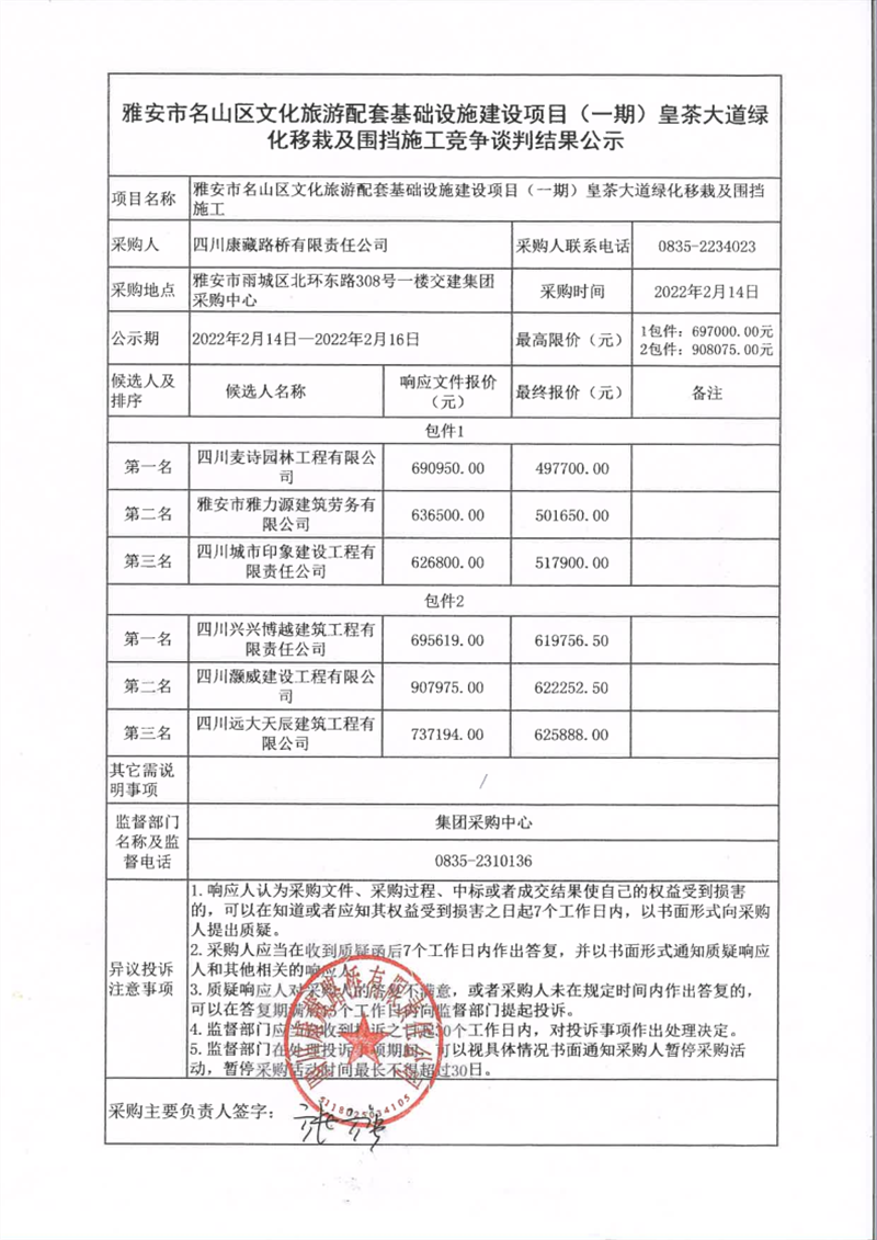 四川康藏路橋有限責(zé)任公司雅安市名山區(qū)文化旅游配套基礎(chǔ)設(shè)施建設(shè)項(xiàng)目(一期)皇茶大道綠化移栽及圍擋施工競爭談判結(jié)果公示