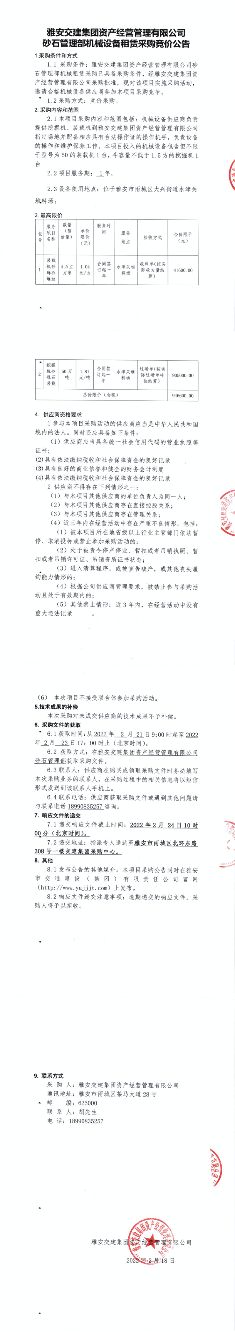 雅安交建集團(tuán)資產(chǎn)經(jīng)營管理有限公司砂石管理部機(jī)械設(shè)備租賃采購競(jìng)價(jià)公告