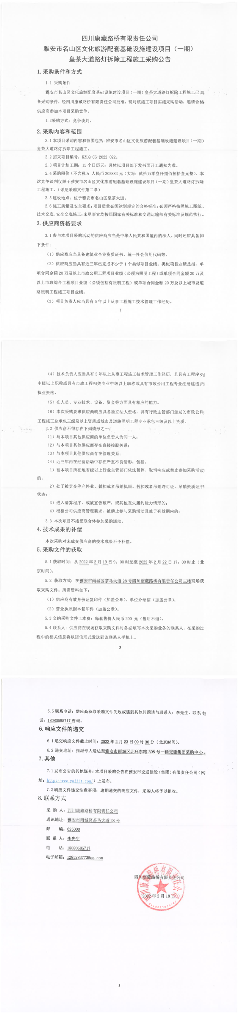 四川康藏路橋有限責(zé)任公司雅安市名山區(qū)文化旅游配套基礎(chǔ)設(shè)施建設(shè)項(xiàng)目(一期)皇茶大道路燈拆除工程施工采購公告