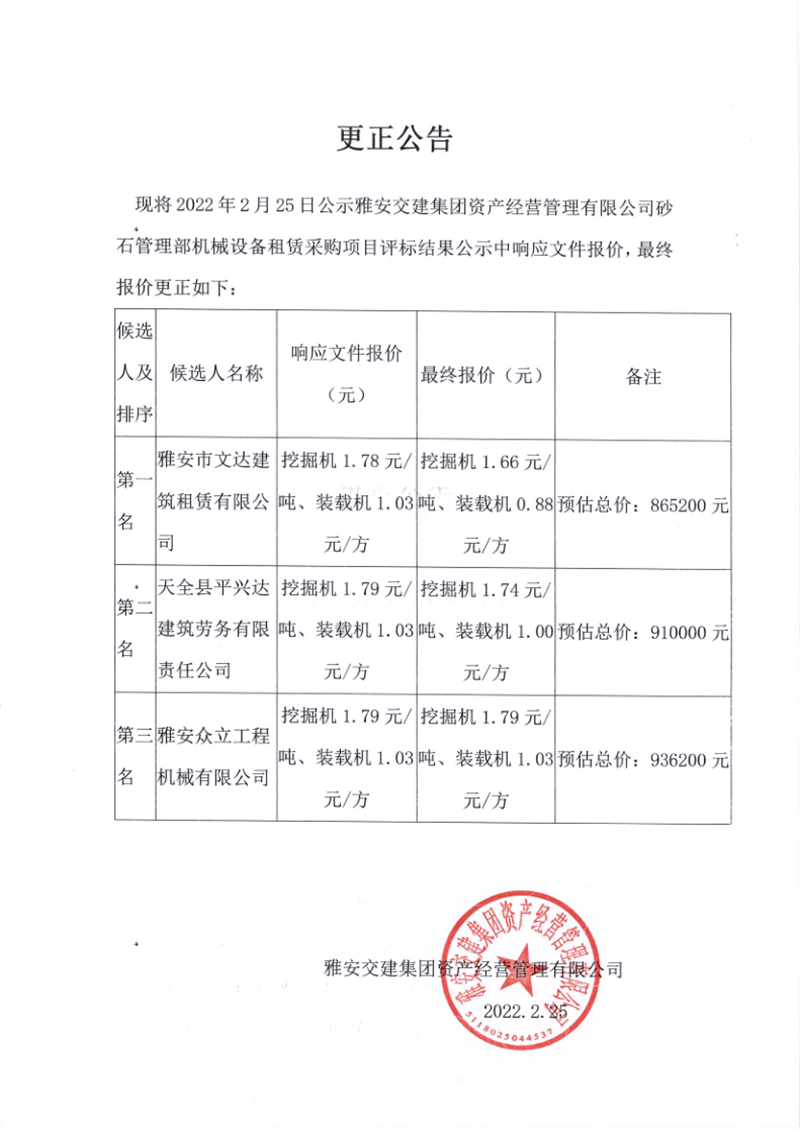 雅安交建集團(tuán)資產(chǎn)經(jīng)營(yíng)管理有限公司砂石管理部機(jī)械設(shè)備租賃采購(gòu)項(xiàng)目評(píng)標(biāo)結(jié)果公示更正公告