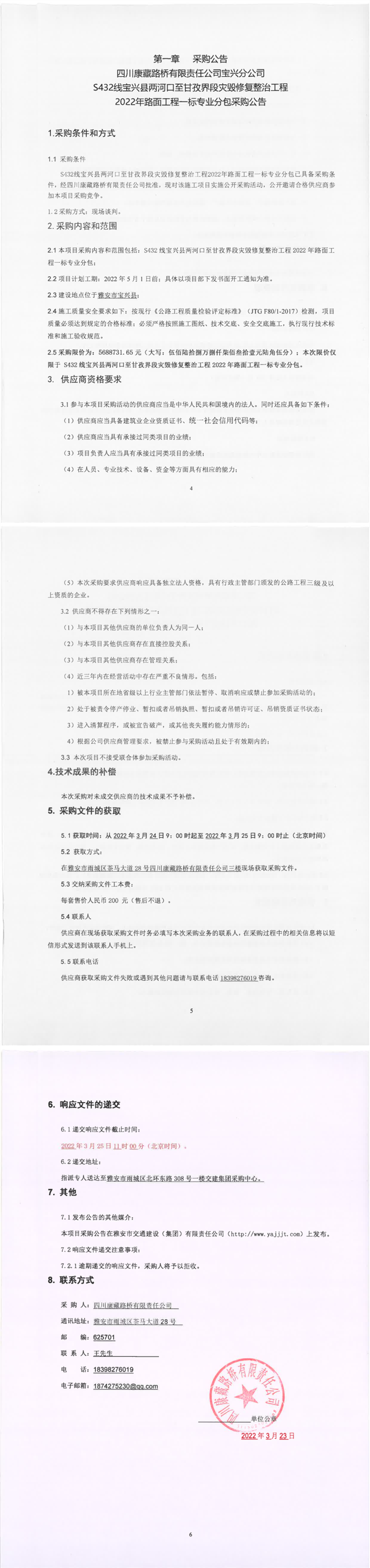 四川康藏路橋有限責(zé)任公司S432線寶興縣兩河口至甘孜界段災(zāi)毀修復(fù)整治工程2022年路面工程一標(biāo)專業(yè)分包采購(gòu)公告
