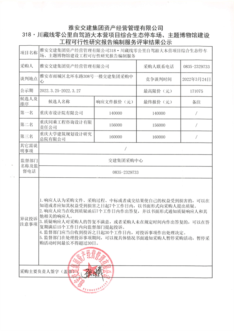 雅安交建集團(tuán)資產(chǎn)經(jīng)營管理有限公司318.川藏線零公里自駕游大本營項(xiàng)目綜合生態(tài)停車場(chǎng)、主題博物館建設(shè)工程可行性研究報(bào)告編制服務(wù)評(píng)審結(jié)果公示