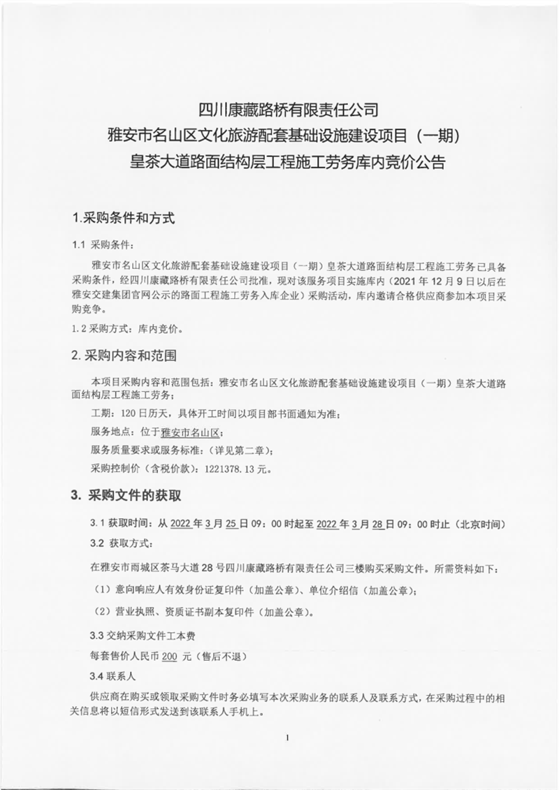 四川康藏路橋有限責任公司雅安市名山區(qū)文化旅游配套基礎(chǔ)設(shè)施建設(shè)項目(一期)皇茶大道路面結(jié)構(gòu)層工程施工勞務(wù)庫內(nèi)競價公告