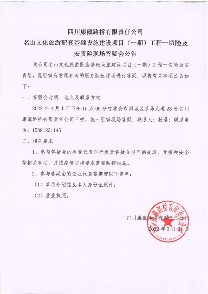 四川康藏路橋有限責任公司名山文化旅游配套基礎設施建設項目(一期)工程一切險及安責險現(xiàn)場答疑會公告