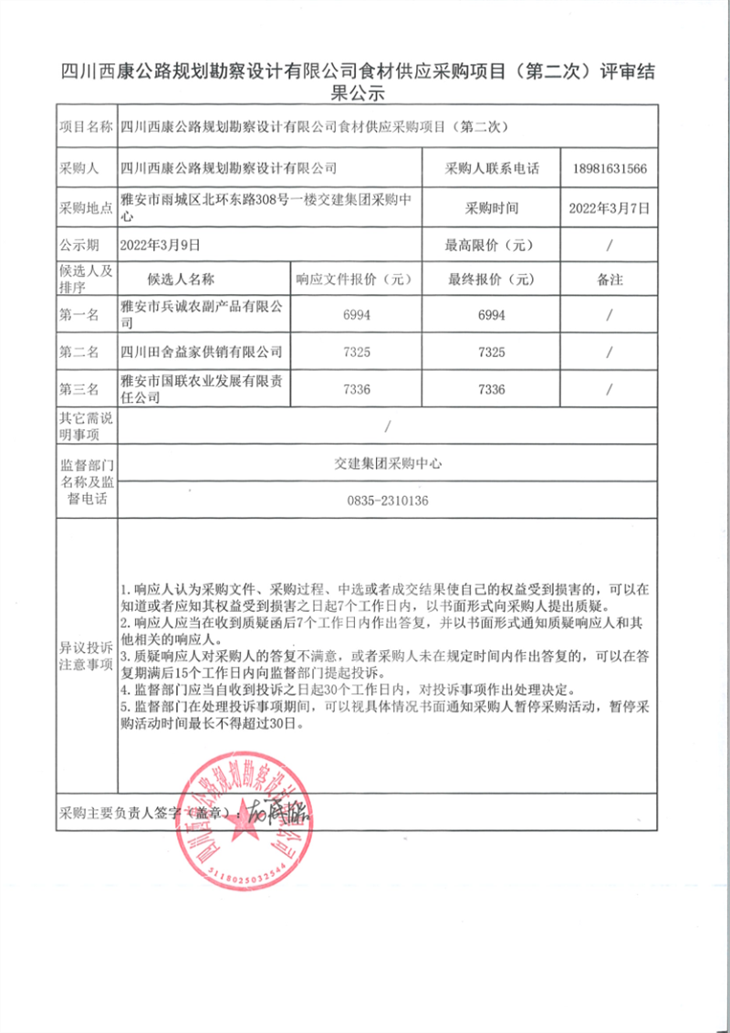 四川西康公路規(guī)劃勘察設(shè)計(jì)有限公司食材供應(yīng)采購項(xiàng)目(第二次)評審結(jié)果公示